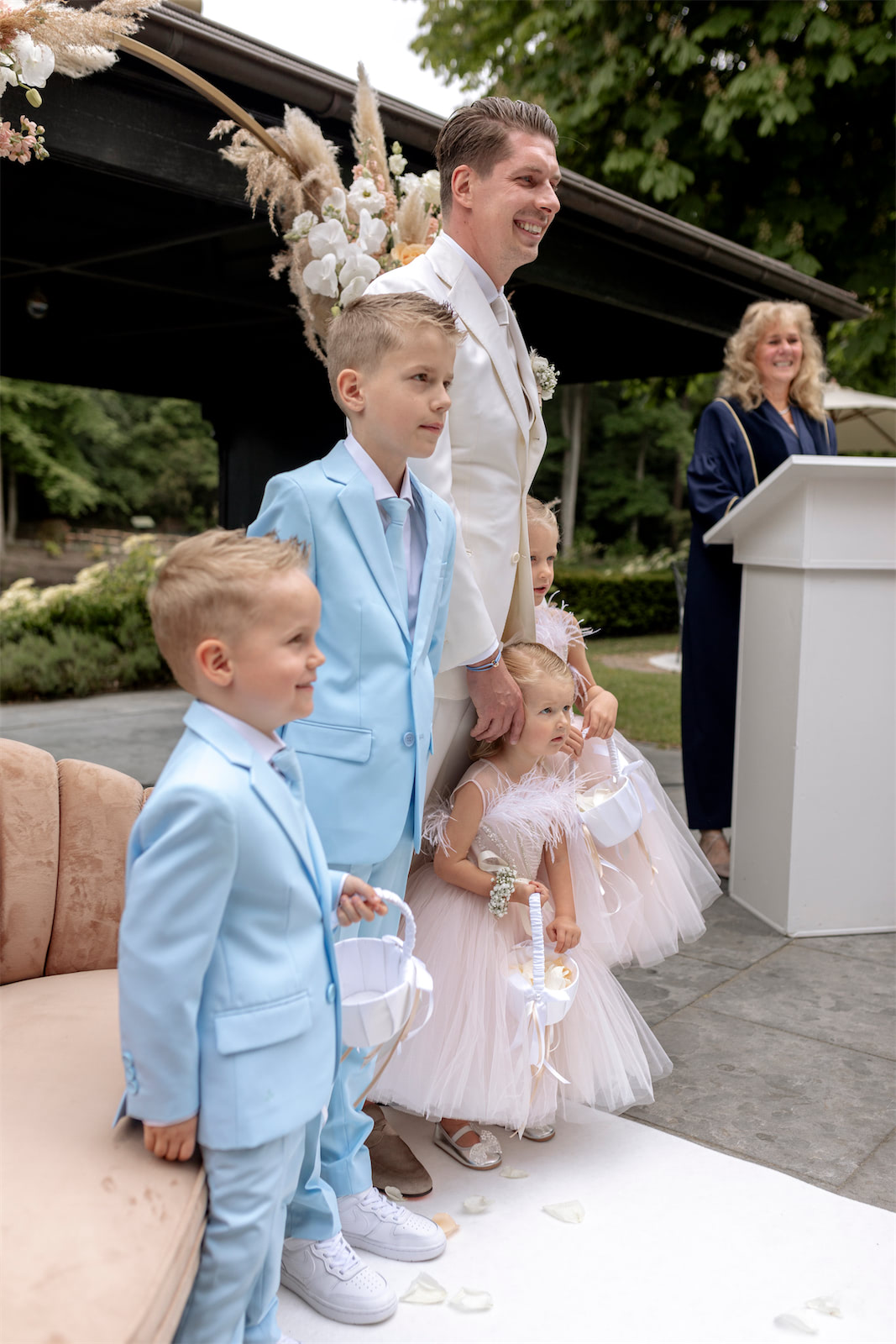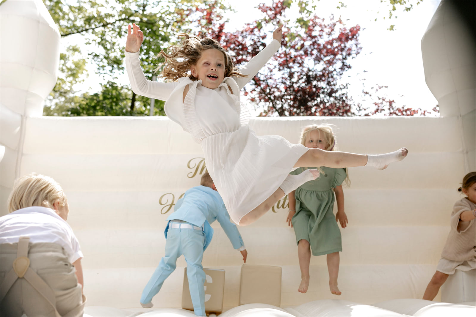 De eerste dag bij Kasteel De Wittenburg had die magische mix van tijdloze elegantie en “good vibes”. Terwijl de zon de kasteeltuinen in een gouden gloed zette, waren we getuige van een ceremonie die een echt cadeau was voor onze camera’s. We zochten niet naar de perfecte foto, we zochten naar de waarheid: de gedeelde tranen tijdens de geloften die iedereen raakten, gevolgd door die spontane lachbuien die de plechtigheid van de plek doorbraken. Dat is voor ons storytelling; het vastleggen van de brok in de keel en de lach die bevrijdt.